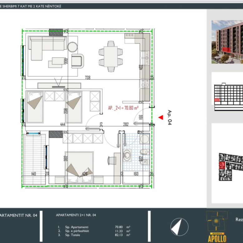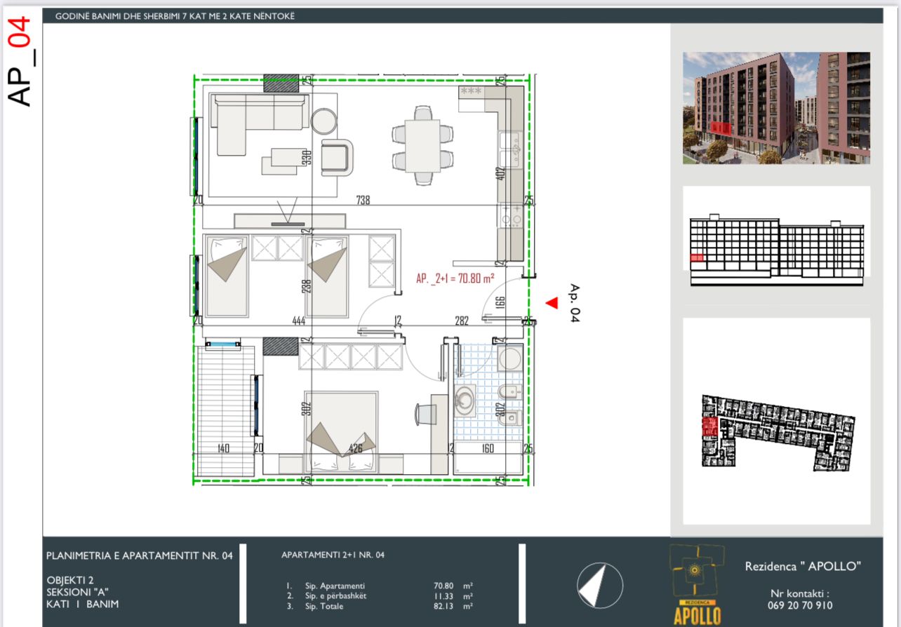 Apartamenti ka nje siperfaqe prej 82.13 m2 dhe ndodhet ne Rezidencen Apollo ne Paskuqan.
