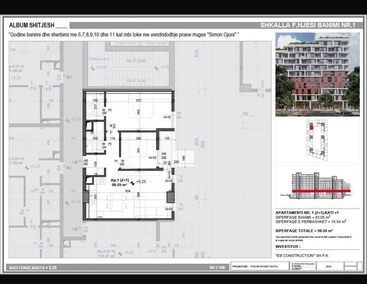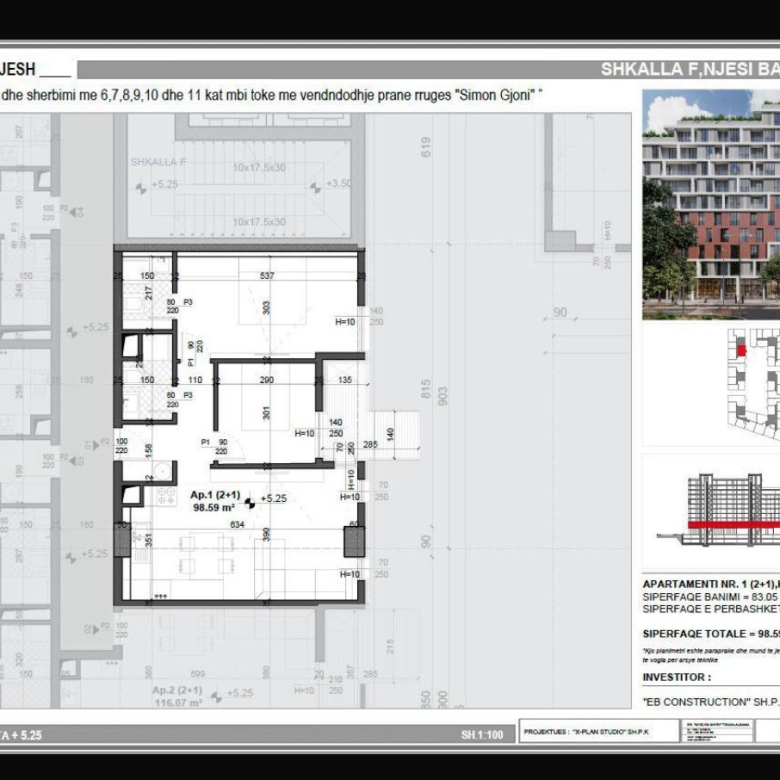 Apartamenti ka nje siperfaqe prej 98.59 m2 dhe ndodhet tek Ish Fusha Aviacionit.
